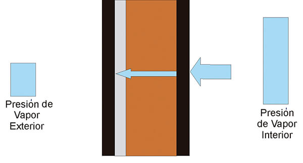 Las características de permeabilidad al vapor de agua unidas a la distribución de temperaturas de la pared nos van a definir las posibles condensaciones intersticiales.