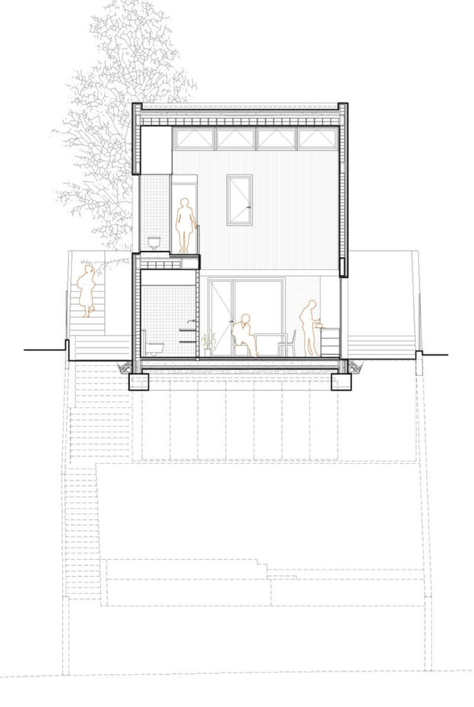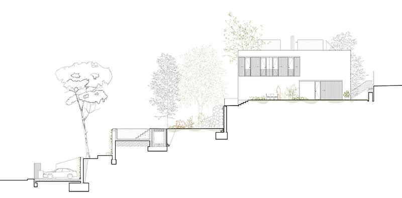 La vivienda se organiza en tres niveles, aprovechando la pendiente del terreno. El acceso principal se sitúa a nivel de calle, donde se encuentran las zonas de vida diaria, incluyendo un amplio espacio de estar, comedor y cocina. Estos espacios se sitúan ligeramente por debajo del nivel de la calle para garantizar la privacidad y mejorar la integración en la pendiente.