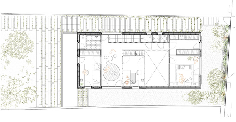 A pesar de estos condicionantes, la casa logra sacar el máximo provecho de su situación, potenciando la integración con el paisaje, optimizando el uso de energía pasiva y minimizando el impacto ambiental.