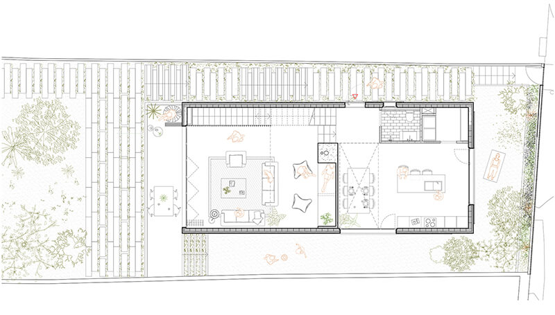 El diseño maximiza el contacto de la vivienda con el terreno y crea una fluida relación entre interior y exterior, característica fundamental del proyecto.