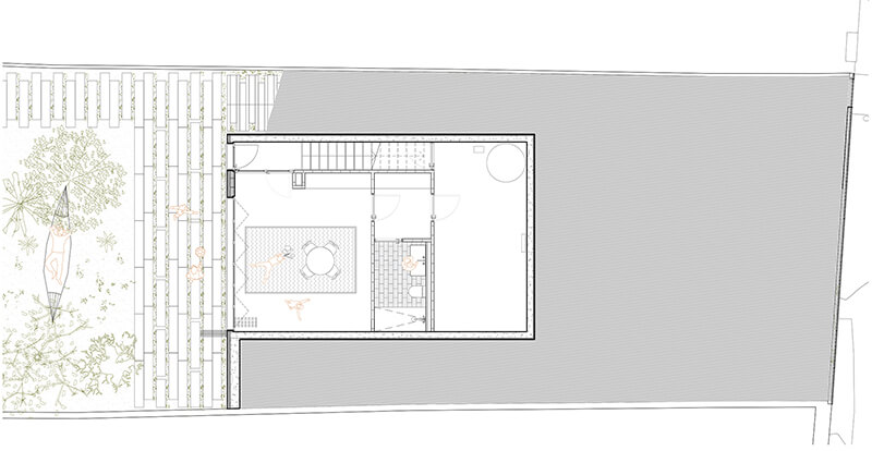 Desde el punto de vista bioclimático, la pendiente y la orientación del terreno plantearon retos específicos. Aunque la fachada sur, ideal para captación solar, se ve parcialmente bloqueada por una edificación vecina, el diseño compensa esta limitación con soluciones como dobles espacios y atrio en cubierta, que permiten la entrada de luz y calor natural en el interior de la vivienda. Esta solución también mejora la ventilación cruzada, reduciendo la necesidad de climatización mecánica y manteniendo el confort térmico durante todo el año.