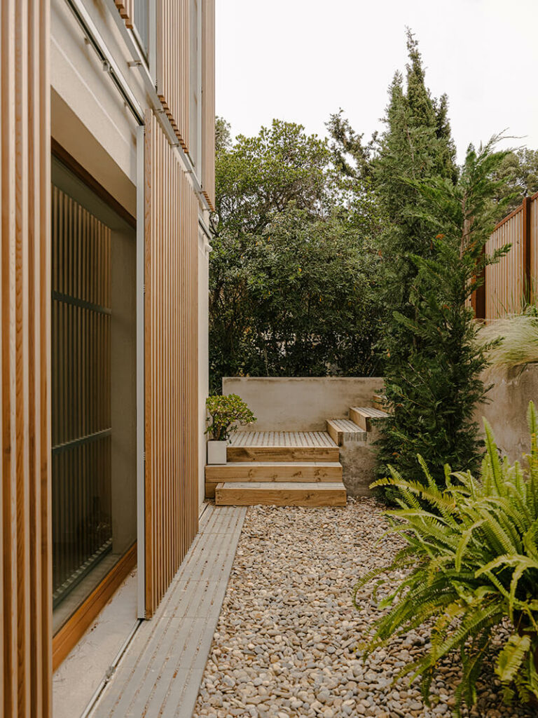 La elección de estos materiales busca eficiencia energética y también garantizar un ambiente interior saludable, sin la emisión de contaminantes tóxicos. Además, se ha dado prioridad al uso de pavimentos permeables en los espacios exteriores, que permiten la transpiración del terreno y ayudan a regular la humedad y temperatura. Estos pavimentos también favorecen la evaporación natural, contribuyendo a mantener un microclima confortable alrededor de la vivienda.